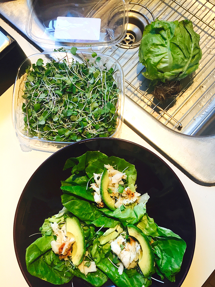 先日、家族の友人が釣りに行ったとの事で新鮮な魚をいただき、ちょうどタコスの日(はい、これはアメリカ文化です)だったので、何か作ろうと思い立ちました。バターレタス(根っこがまだついています!)とマイクログリーンが冷蔵庫にあったので、それを使う事にしました。トルティーヤの代わりにバターレタスを選び、アボカドオイルとガーリックで調理した白身の魚にマイクログリーンをトッピングしました。嬉しいことに、マイクログリーンはとても栄養価が高くビタミンCの宝庫で、ベータカロチンも豊富です。私は、手作りのライムアボカドオイルドレッシングをトッピング、さらにアボカドスライスも追加しました。野菜をたっぷり使って、牧草地で育った肉、ワイルドサーモンやシュリンプでもアレンジできます!クリエイティブに、そして自分の好きな物で楽しんで!